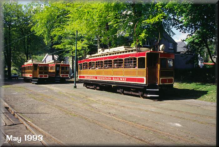 Three Snaefell Mountain Railway cars await their turn to depart for the Summit.