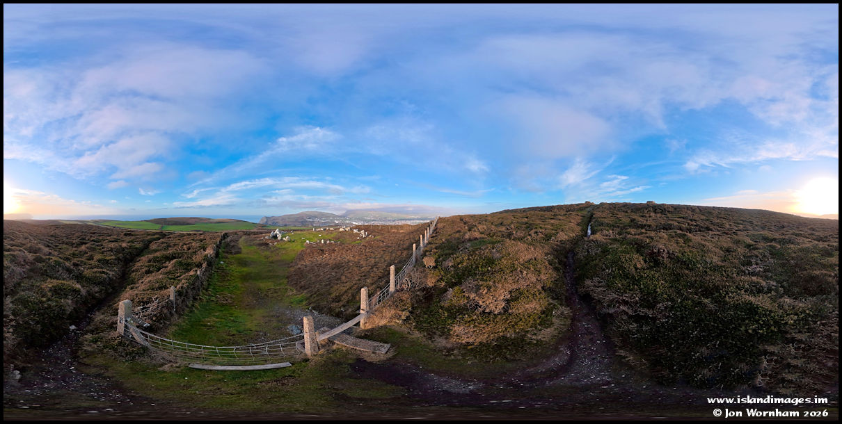 360 degree panorama at the Meayll Hill Circle. Just visible on the hilltop above is a WW2 era 'Pillbox', one of the defensive positions for the extensive Chain Home Low radar station there.