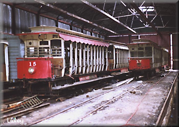 Open cars 15 & 17 lurk inside the dilapidated depot at Laxey.